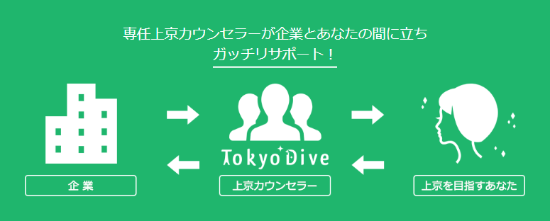 TokyoDiveは「東京で働きたい」「上京したい」と考えている方に上京のきっかけを与えてくれる、他では見ることのできない夢のような支援サービスなのです。