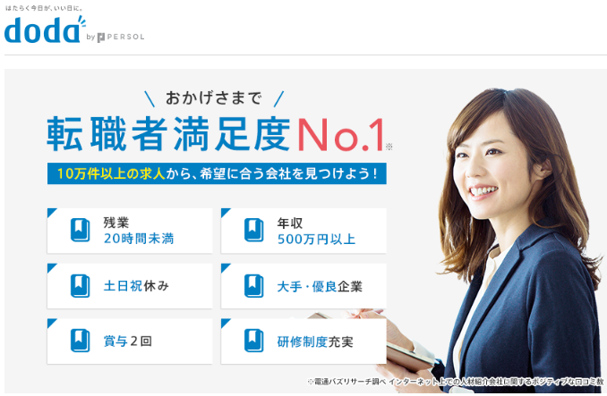 「業界大手」「10万件を超える求人数」「キャリアアップ向け」の特徴を持つDODA。